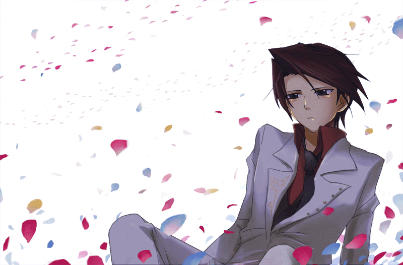 00s1boyblack eyesflowerjacketmale focusnecktiepetalsred hairshort hairsittingsolowhite background