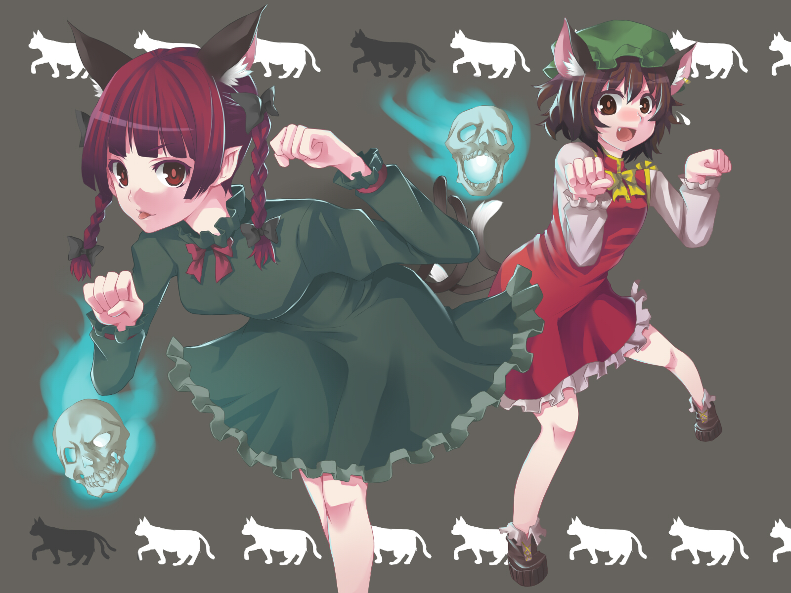 2girlsanimal earsbraidcatcat earscat tailextra earsfemale focushatlooking at viewermultiple girlsmultiple tailspaw poseribbonskulltailtwin braids
