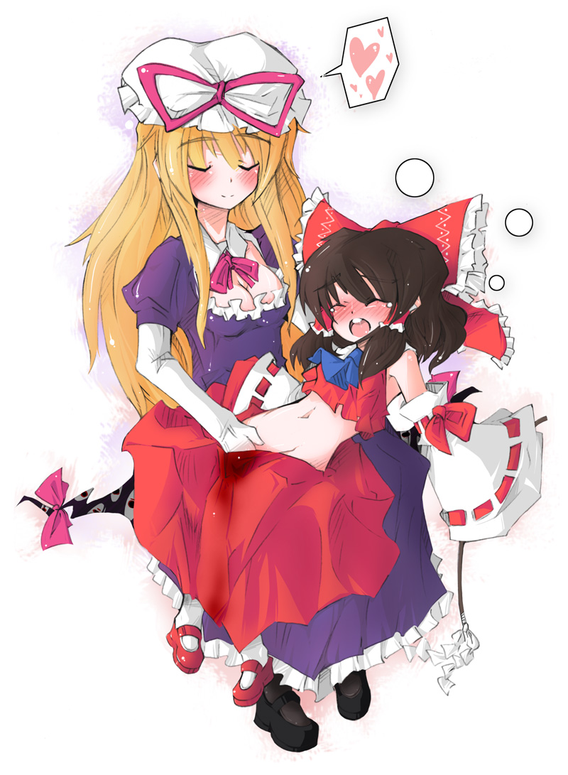 2girlsage differenceblonde hairblushbreastsbrown haircleavagedetached sleeveselbow glovesfemale focusfingeringgap (touhou)glovesgoheihatheartlolilong hairmary janesmedium breastsmultiple girlsonee-loliribbonshoesshort hairskirtwhite glovesyuri