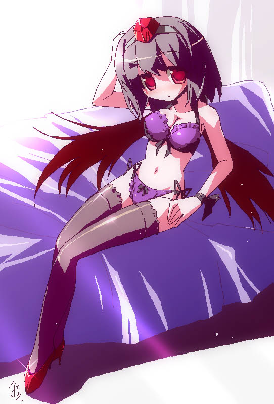 1girlblack hairblack wingsblushbraexpressionlessfemale focushatlingerielooking at viewerpantiessolothighhighsunderwearunderwear onlywings