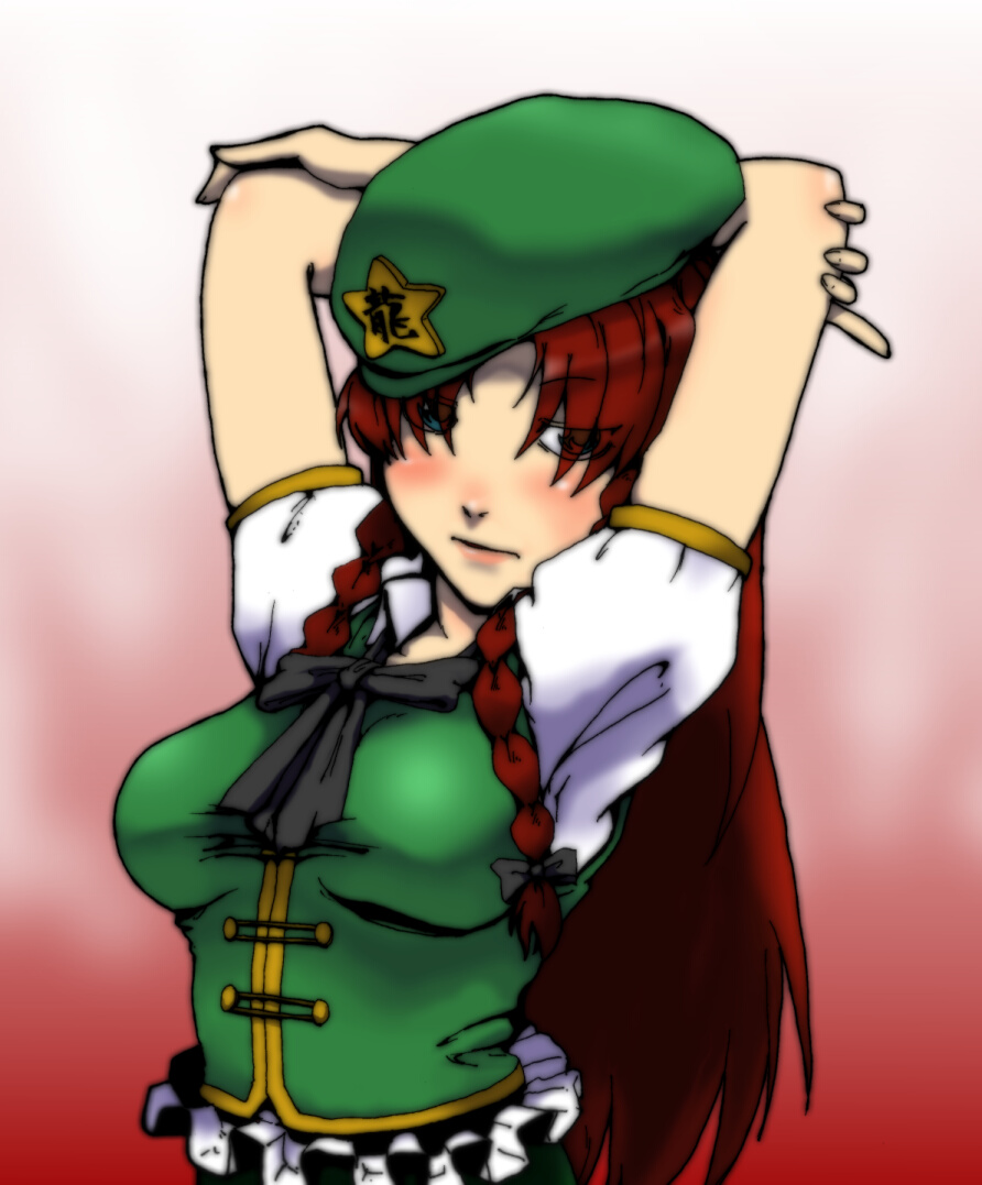 1girlarms behind headarms upblue eyesbraidbreastschina dresschinese clothesdressfemale focusgradient backgroundhatlong hairred hairsolotwin braids