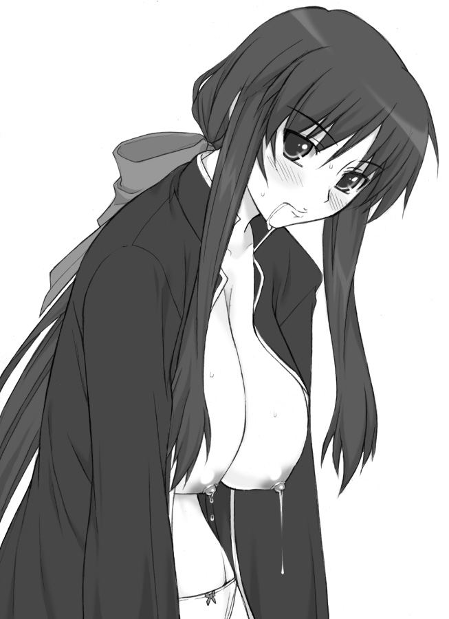 1girlblushbreastscumcum in mouthdrippingfemale focusgreyscalehanging breastshuge breastslactationlong hairmonochromenipplesopen clothesopen shirtpantiesribbonshirtsimple backgroundsolounderwear