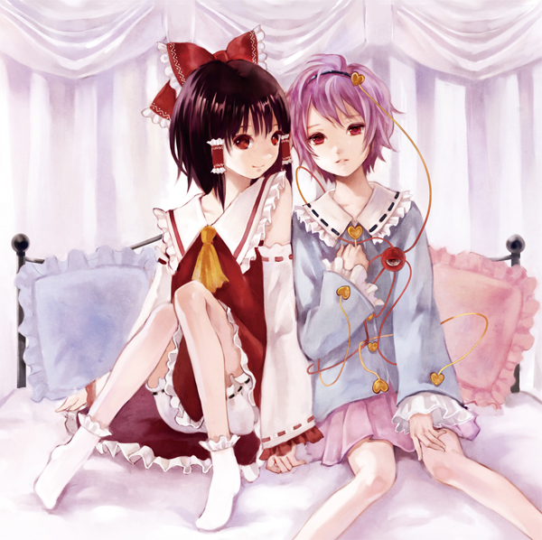 2girlsbedbowbrown hairdetached sleevesfemale focushair bowhairbandheartmultiple girlspurple hairred eyesshort hairsocks