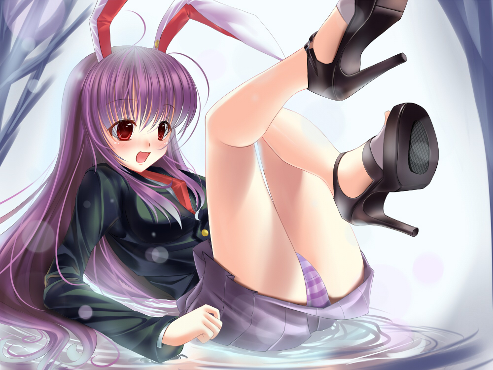 1girlanimal earsblazerfemale focushigh heel sandalshigh heelsjacketlegslong hairlong legsnecktieopen mouthopen shoespantiesplatform heelspleated skirtpurple hairrabbit earsred eyessandalsshoe solesshoesskirtsolostrappy heelsstriped clothesstriped pantiestoesunderwear