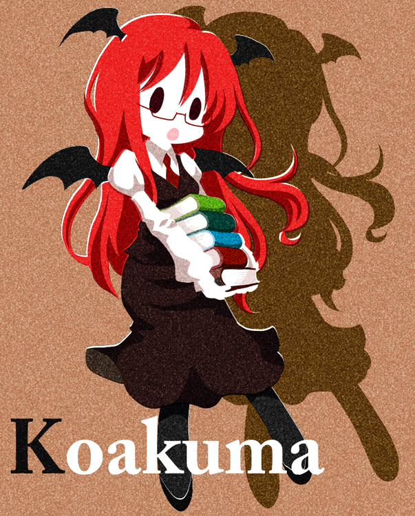 1girlbat wingsbespectacledbookbook stackcharacter namefemale focusglasseshead wingslong hairnecktieopen mouthpantyhosered hairshadowsolowings