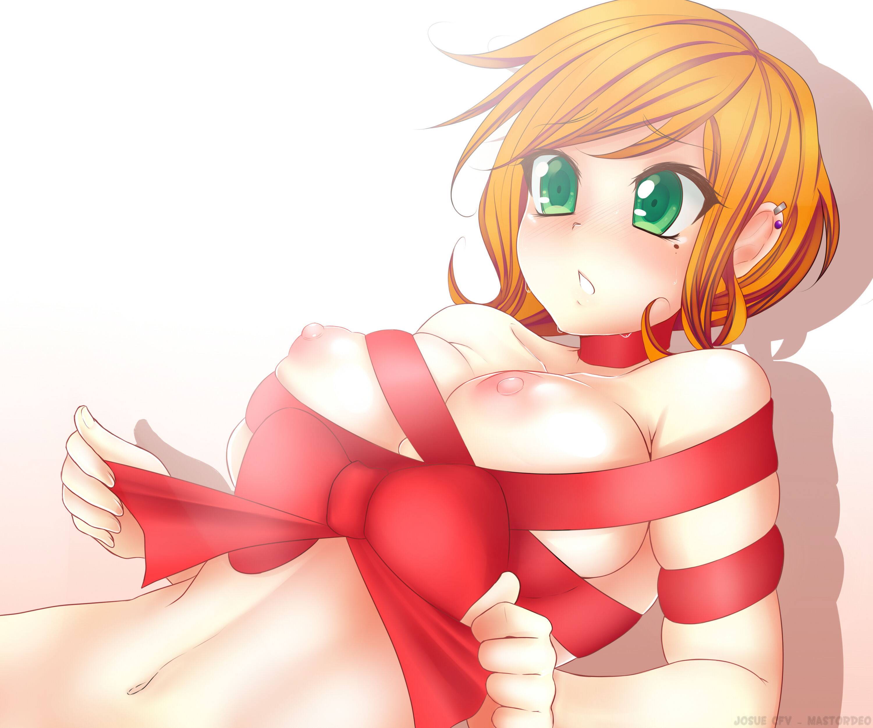 blushbowbreastschokerear piercingfemaleFlag for Deletiongreen eyeslarge breastslyingmolemole under eyenaked ribbonnipplesnudeon backorange hairribbonshort hairsolo
