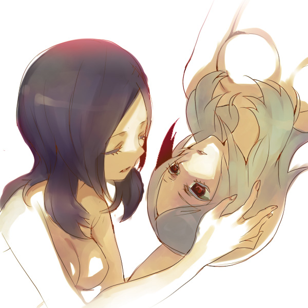:o00s2girlsblack hairblonde hairclosed eyesdual personaexpressionlesshands on another's headholding detached headmultiple girlsnudeparted lipssimple backgroundupside-downwhite background