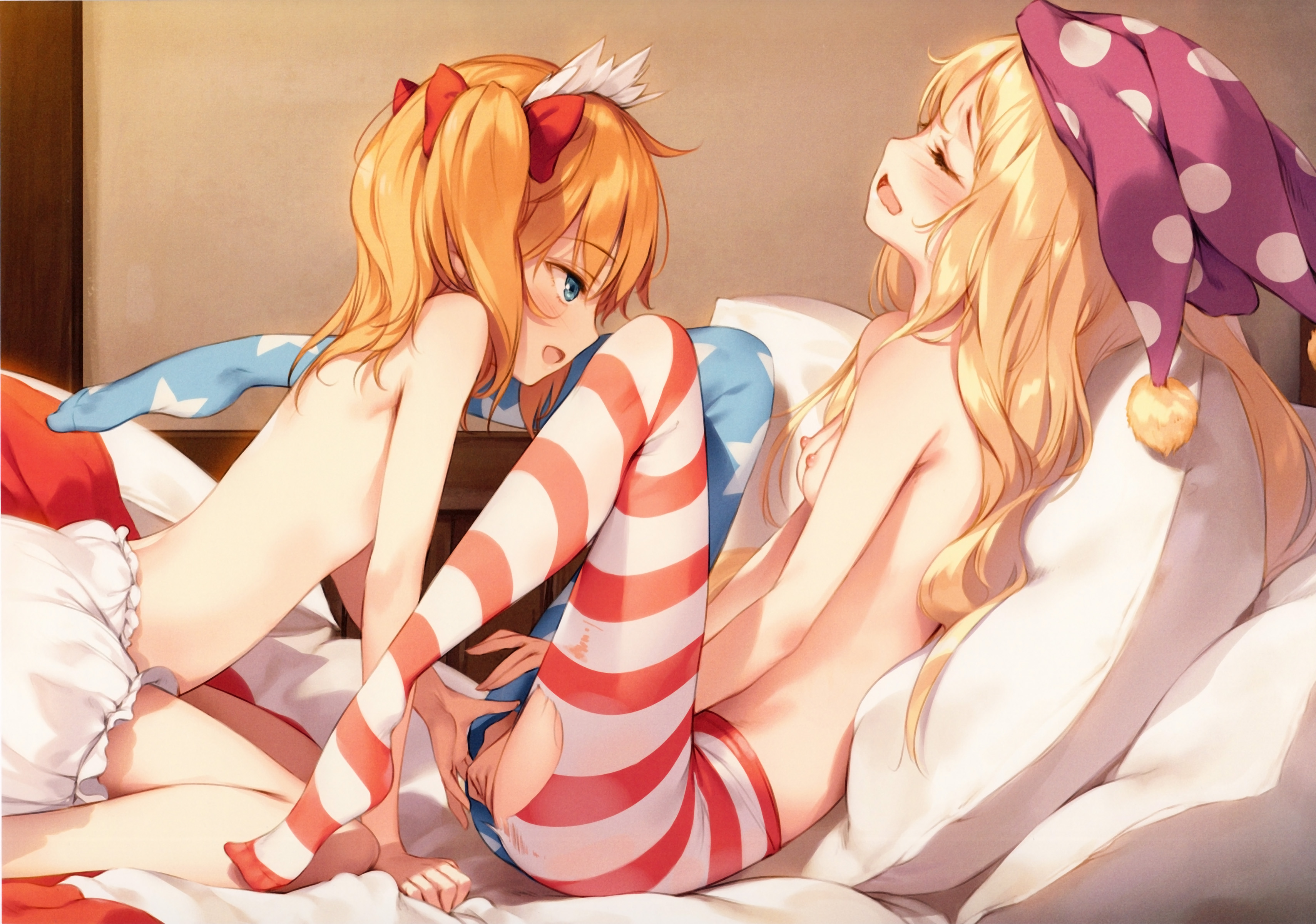 2girlsamerican flag legwearbedblonde hairbloomersblue eyesblushbreastsclosed eyesfemalefingeringFlag for Deletionhair ornamenthatheadgearmultiple girlsnipplespantyhoseribbonsexsmall breaststoplesstorn clothestorn pantyhoseunderwearyuri