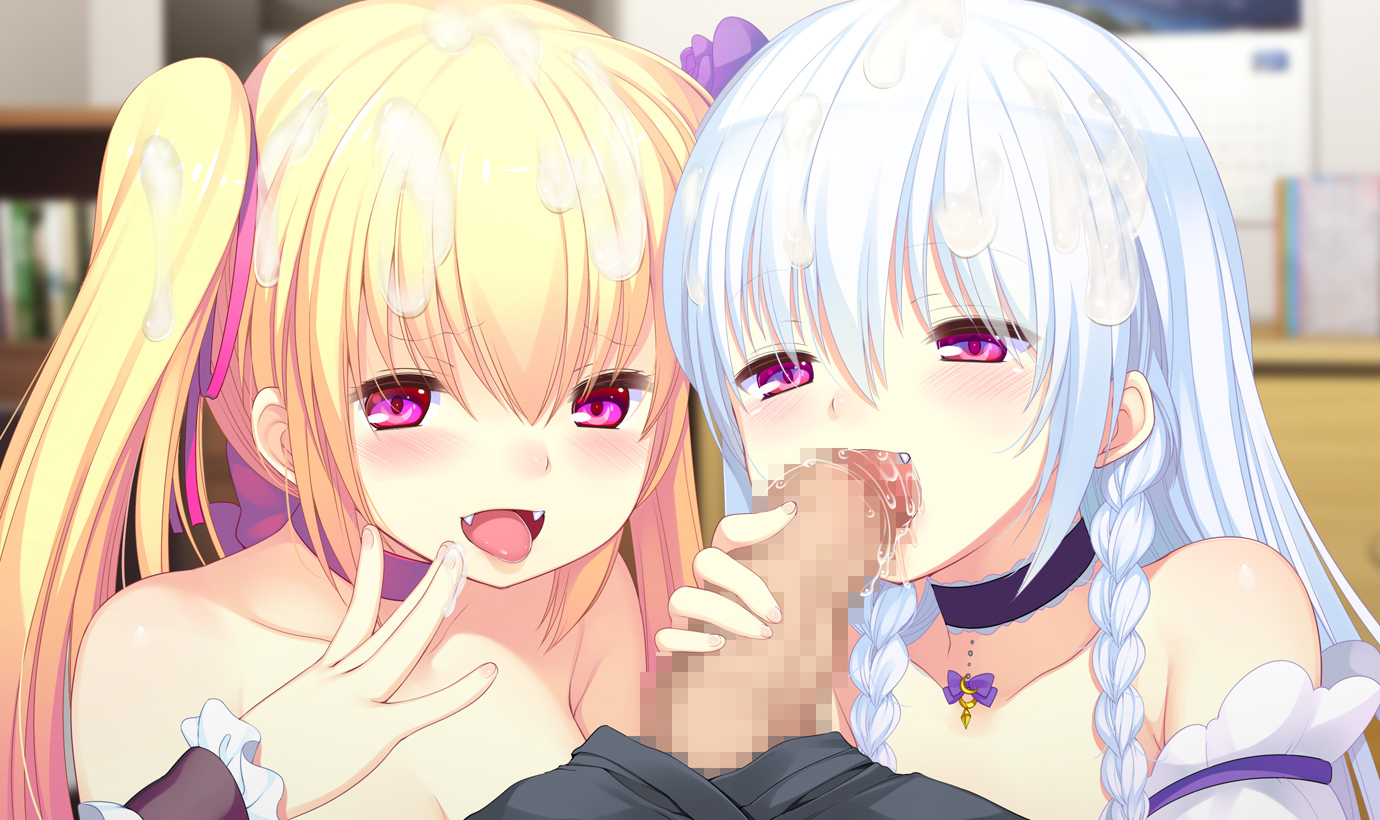 1boy2girlsblonde hairbraidschibi pire! ~kyuuketsu shimai to ecchi de bitch na dousei seikatsu~cumcute fangfellatioFlag for Deletionmultiple girlsoralpurple eyestied hairtwintailswhite hair