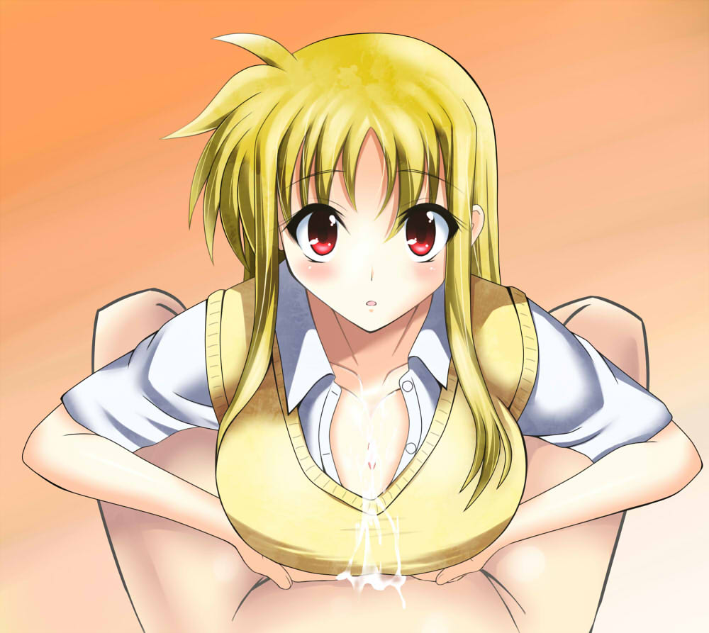 blonde hairblushbreast holdbreastsclothed sexcumcum in clothesfemaleFlag for Deletiongradientgradient backgroundlarge breastslong hairlooking at viewermalepaizuripaizuri under clothespenis under clothesred eyesschool uniformshort sleevesstraight