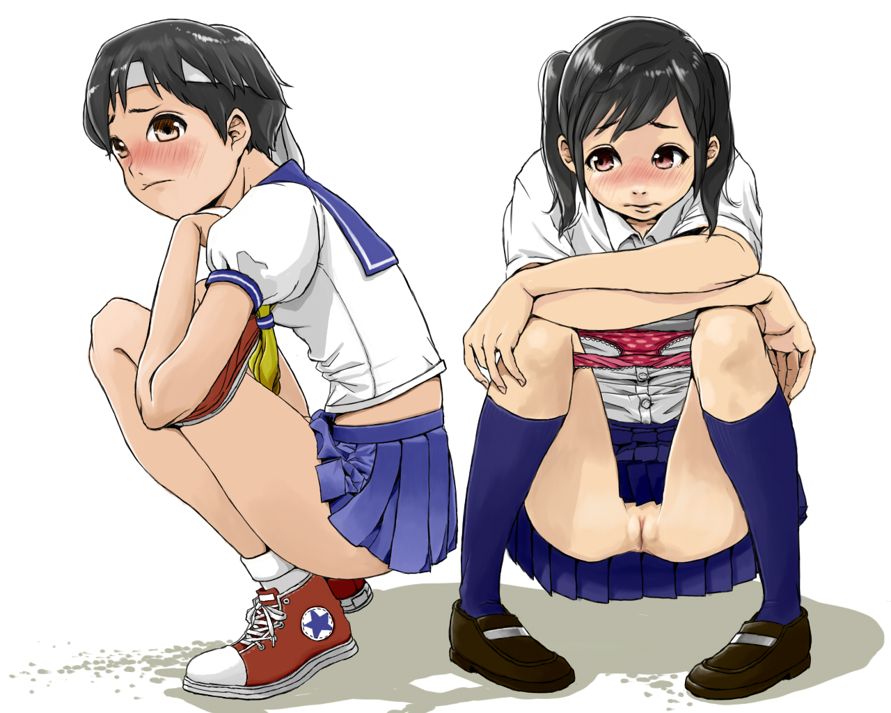 2girlsblack hairblushbrown eyesFlag for Deletionpantiespussypussy juiceschool uniformshort hairsquatting