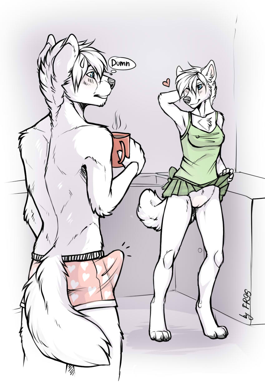 anthrobeverageblushboxersbrotherbulgecaninechest tuftcoffeedigitigradeduoerectionerection under clotheseye contactfemaleFlag for Deletionfoodfurgrinheartinsidemalemammalnightgownnipplespussysiblingsisterskirtskirt liftsmilestandingteasingtufttwinsunderwearwhite furwhite hairwolf