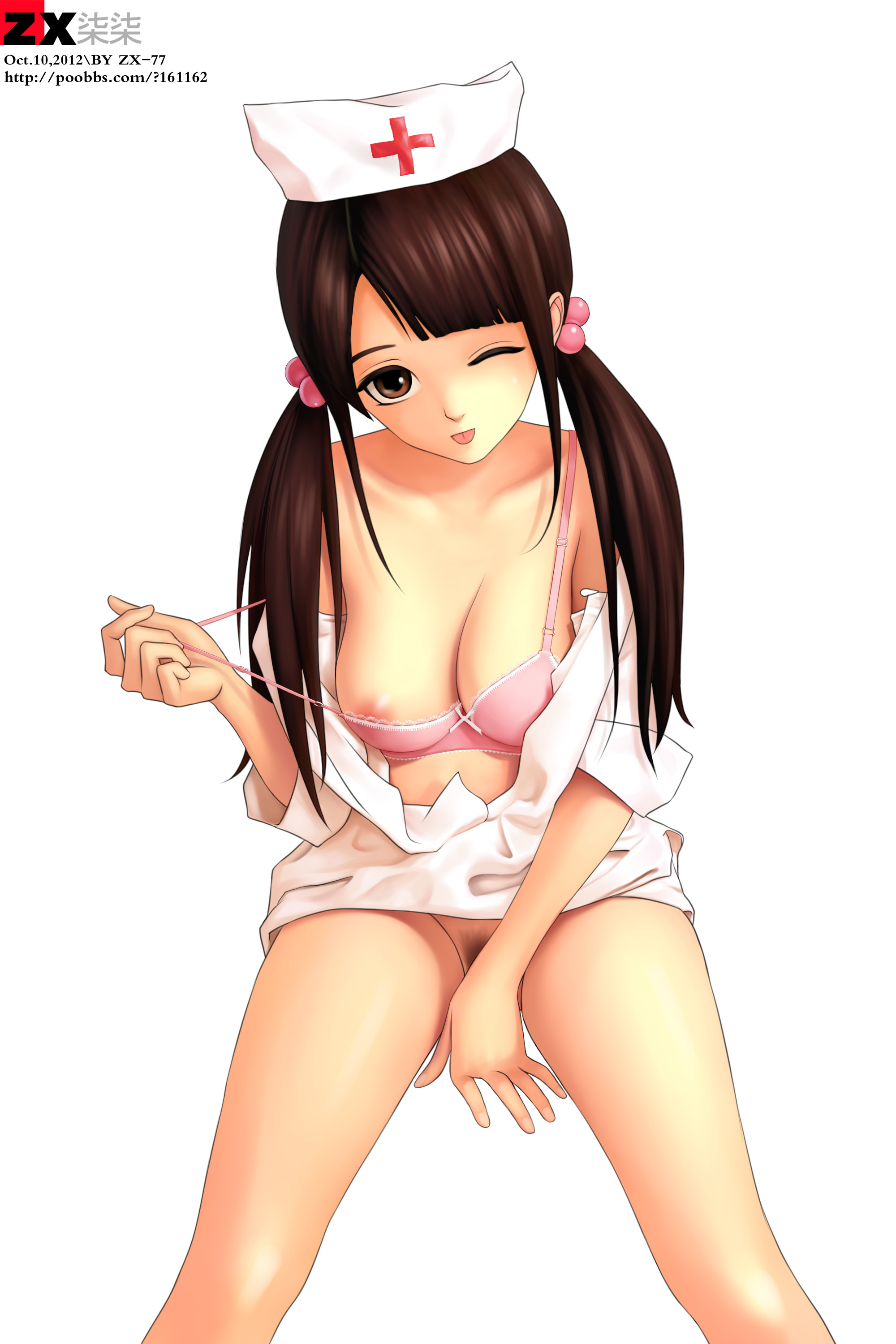 areolaebottomlessbrabreastsbrown eyesbrown hairFlag for Deletionhair bobbleshair ornamentnipplesnurseopen clothesopen shirtpink brapubic hairshirtsolotied hairtonguetongue outtwintailswink