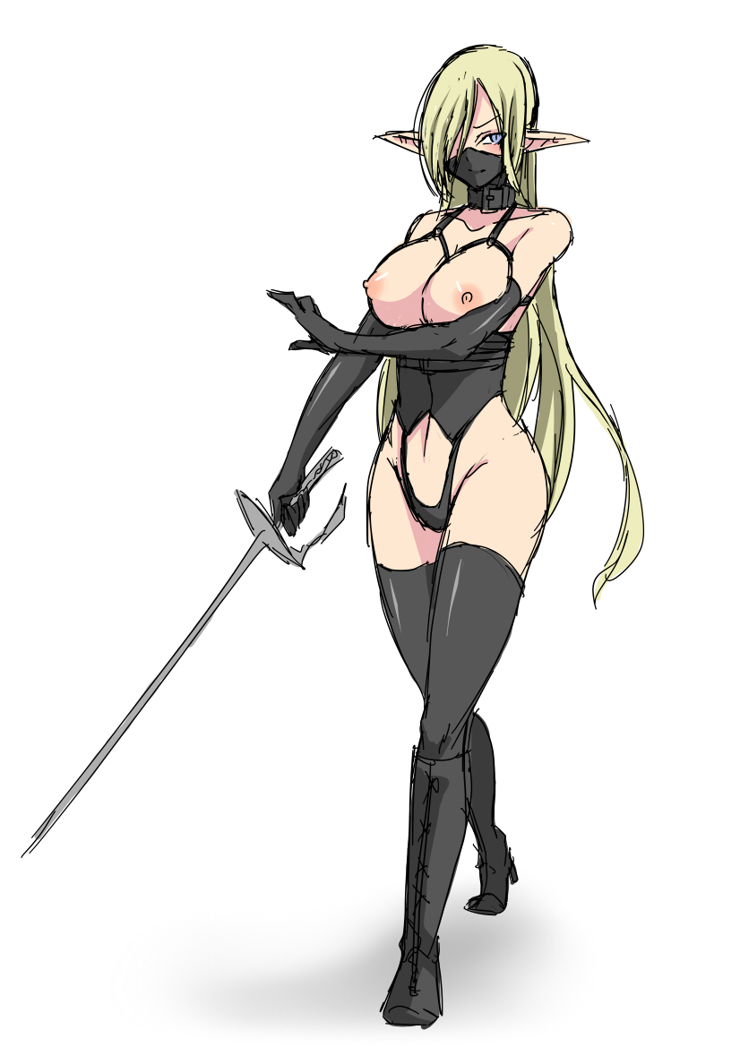 blonde hairblue eyesbootsbreastscollarelbow gloveselfFlag for Deletiongloveshair over one eyelarge breastslatexlatex gloveslatex thighhighslong hairmaskpointy earsswordweapon