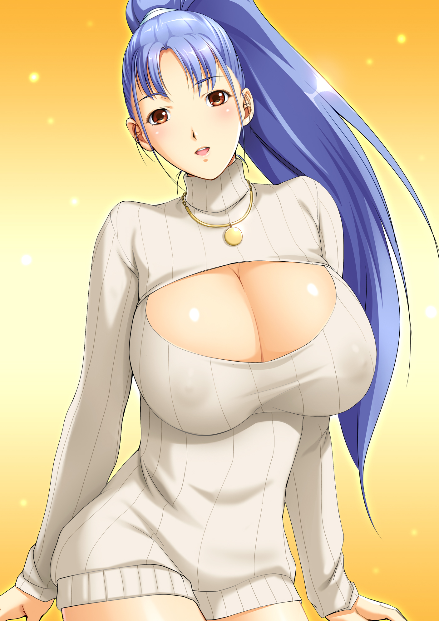 blue hairbreastsbrown eyescleavagefemaleFlag for Deletionjewelrylong hairlooking at viewernecklaceopen-chest sweaterponytailribbed sweatersmilesolosweatertied hairturtleneck