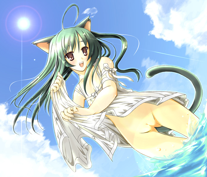 animal earsbeachcat earscat tailcloudsdressdress liftdutch anglefemaleFlag for Deletiongreen hairlong hairpussyseaskysolostandingtailwaterwhite dress