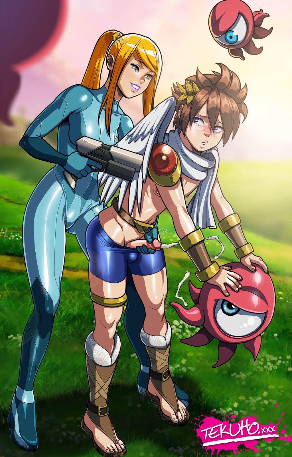 mikimoto haruhiko, guvava, mylene jenius, macross, macross 7, highres, 1990s (style), 1girl, black eyes, blue background, guitar, headgear, instrument, leotard, long hair, pink hair, pointy ears, retro artstyle