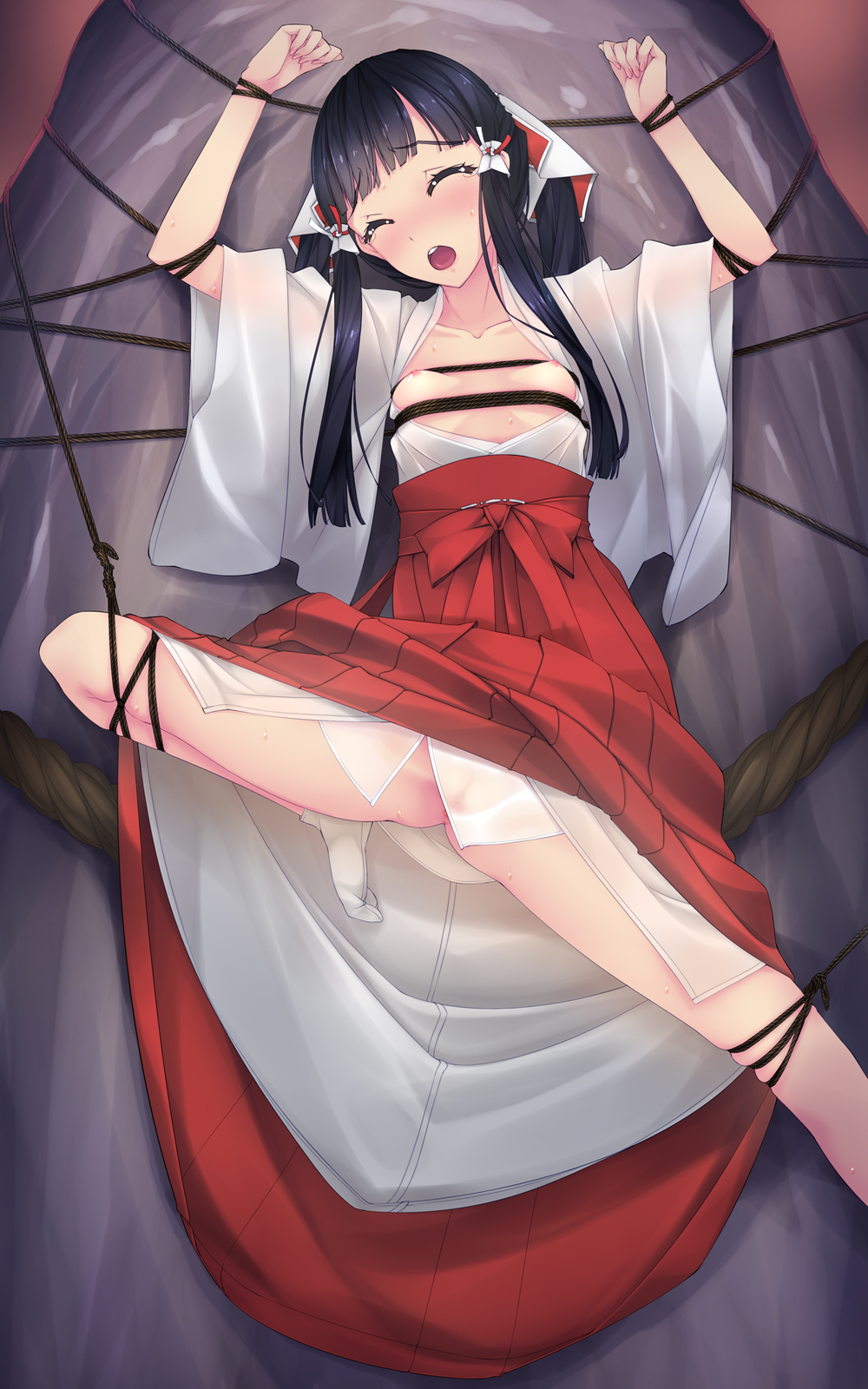 arms upbangsblack hairblunt bangsblushbondagebound wristsbreastsclosed eyesfemaleFlag for Deletionhair ornamenthakamahakama liftjapanese clotheskimonoleg liftlong hairmikonipplesopen clothesopen kimonoopen mouthpussyropesee throughsolospread legssweattearstied hairtwintailswetwet clotheswide sleeves