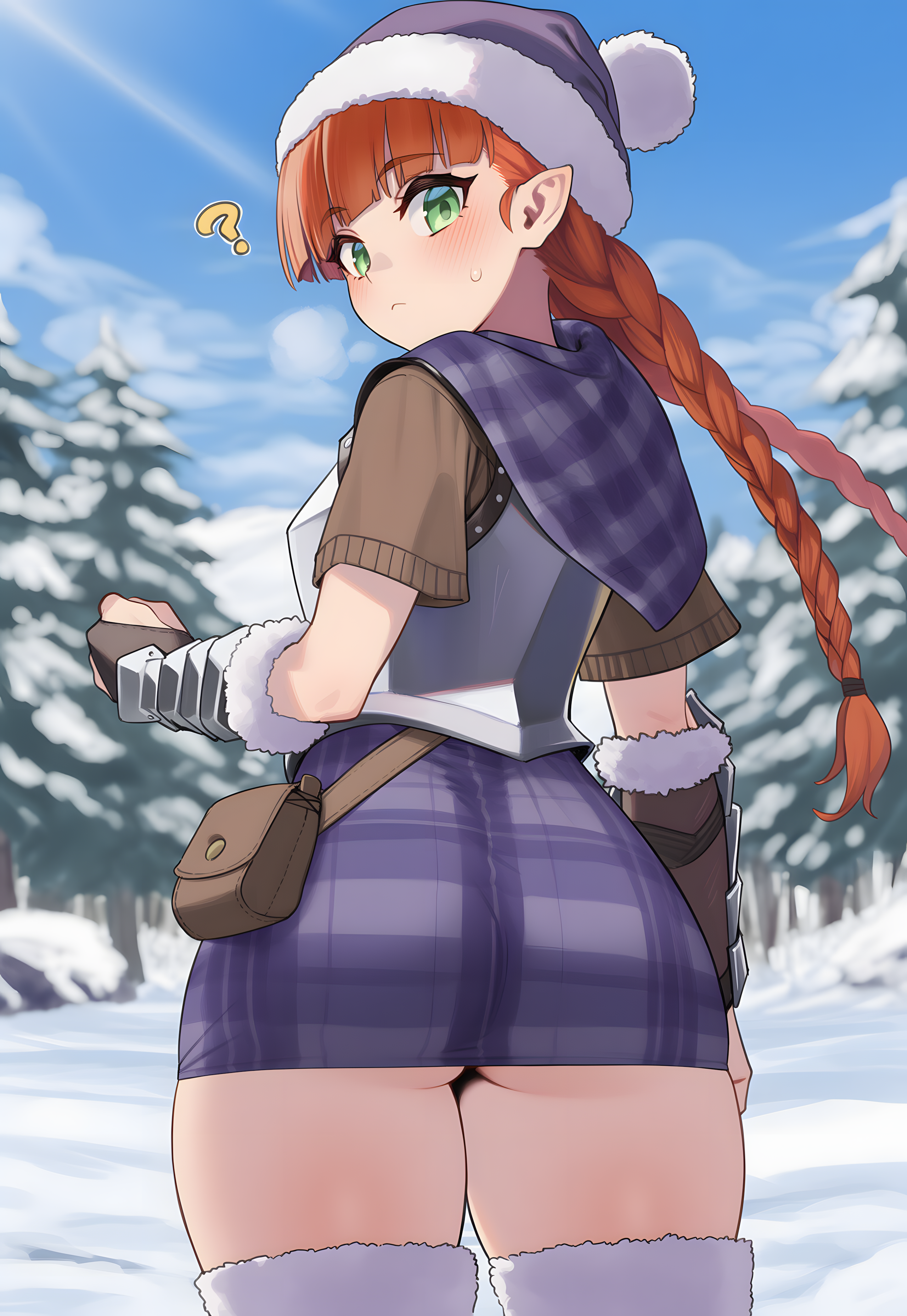 1boyai generatedarmorassbelt pouchblue skyblunt bangsblushbraidbrown shirtclosed mouthclothingdayelffemaleFlag for Deletionfrom behindfur trimglovesgreen eyeshatheadwearhuge asslegwearlong hairlooking at viewerlooking backminiskirtorange hairoutdoorspear shapedplaidplaid skirtpointy earspouchpurple headwearpurple skirtred hairshaddaishort sleevesskirtskysnowsnowingsolosweatdropthick thighsthighhighsthighstreetwin braidstwintailsunderbuttunicorn overlordwinteryunifi (unicorn overlord)