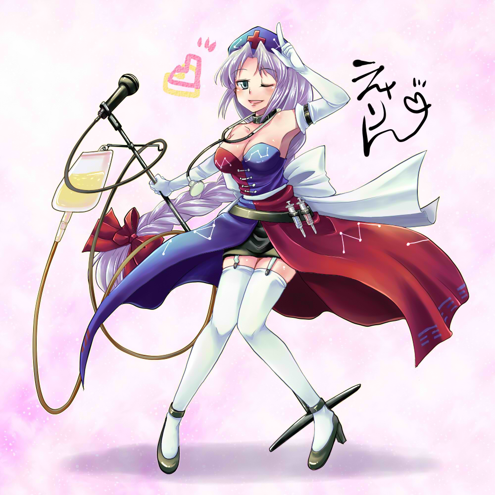 1girlarmpitsbreastscharacter namechokercleavageelbow glovesfemale focusgarter strapsgloveshigh heelsidolintravenous dripknees together feet apartlong hairmicrophonemicrophone standnurseone eye closedshoessolostethoscopesyringethighhighswhite gloveswink