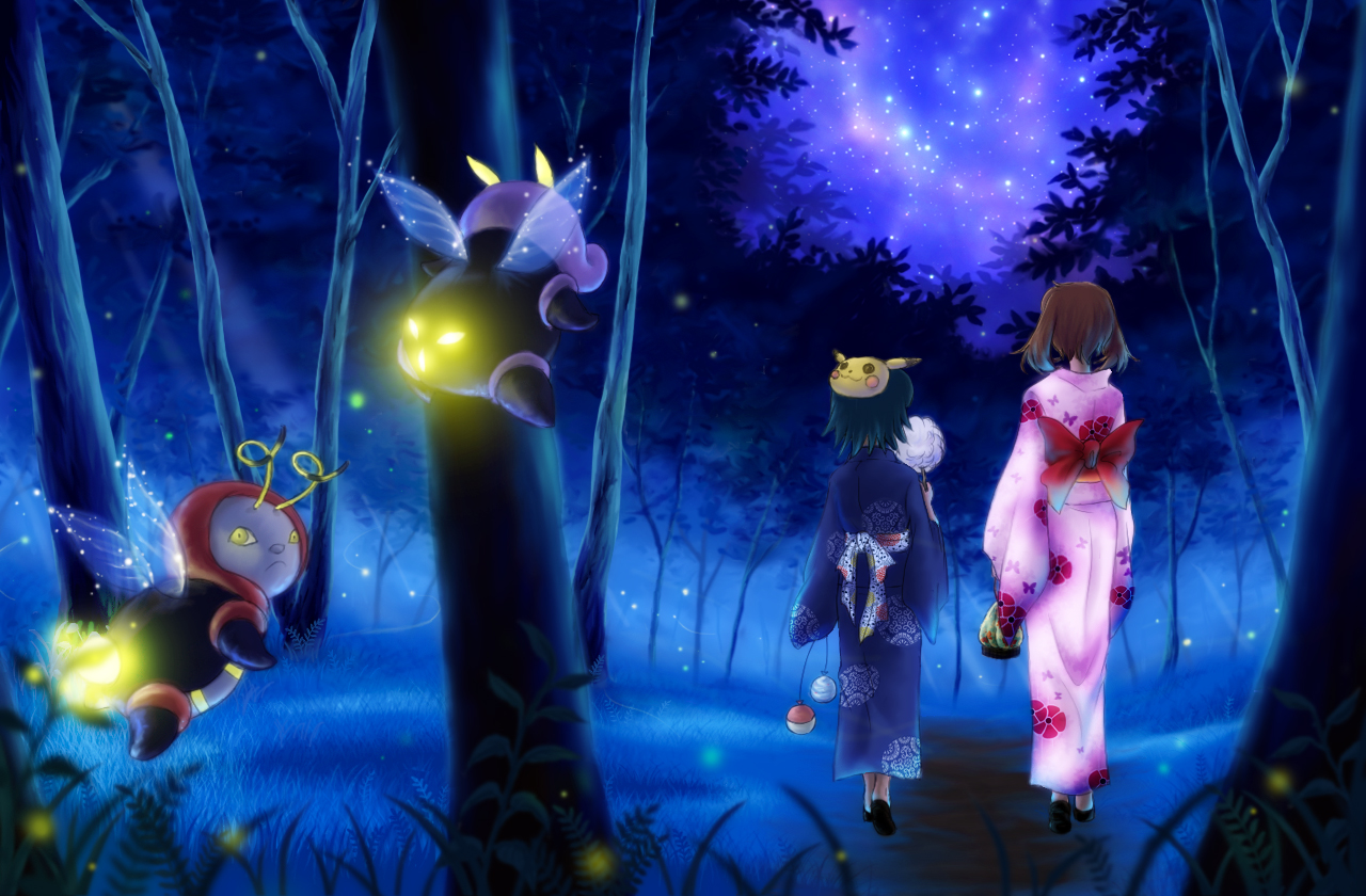 1boy2girlsage differenceblack hairbowbrother and sistercotton candyfoodforestgen 1 pokemongen 3 pokemonholdingholding cotton candyholding foodjapanese clotheskimonolanternmaskmultiple girlsnaturenightpokemon (creature)siblingsstar (symbol)treeyellow eyes