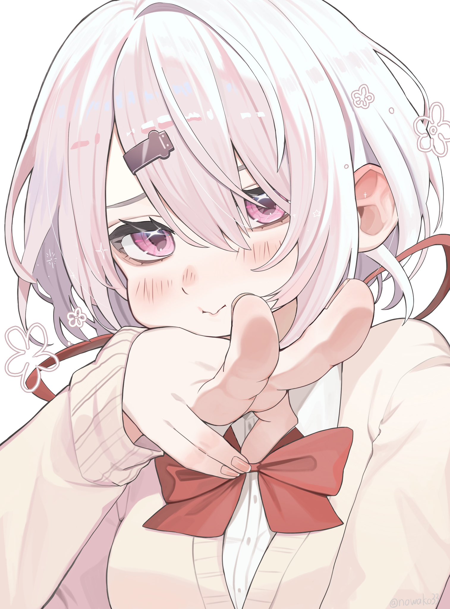 1girlblushbowbowtiebrown cardigancardiganclosed mouthgradient hairhair ornamenthaircliplooking at viewermulticolored hairnoko (nowako33)pink backgroundpink eyespink hairpoutred bowred bowtieschool uniformshirtsimple backgroundsoloupper bodyvvirtual youtuberwhite hairwhite shirt