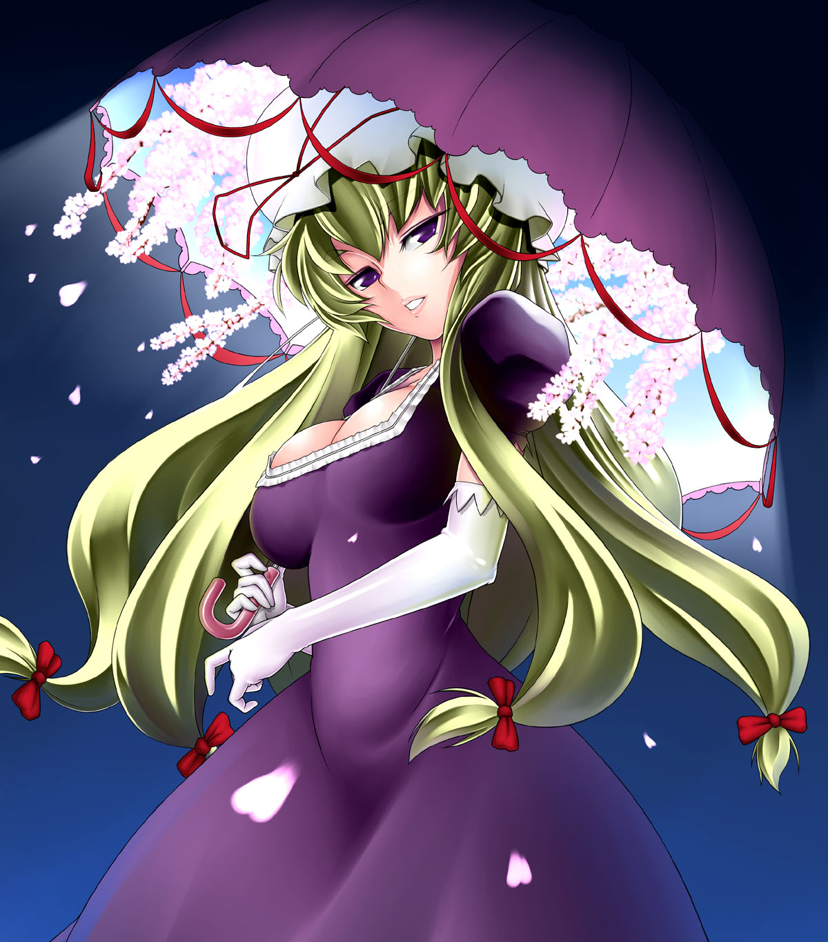 1girlblonde hairbowbreastscherry blossomscleavageelbow glovesfemale focusgloveshair bowhatlarge breastslong hairmultiple hair bowspetalspurple eyesribbonsoloumbrellawhite gloves