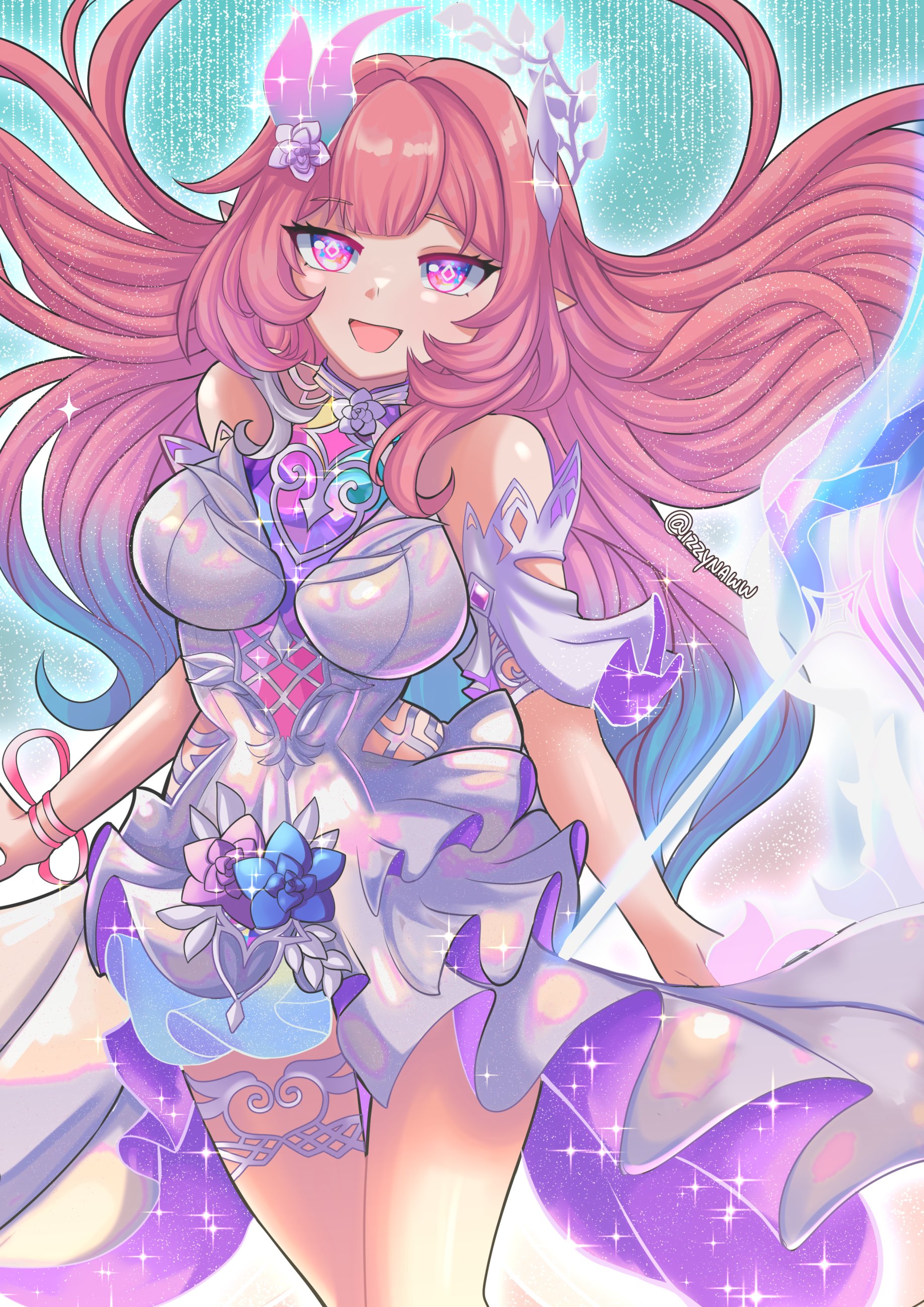 1girlaqua hairbare shouldersbreastsdiamond (shape)diamond-shaped pupilsdressflowerhair flowerhair ornamentlarge breastslong hairlooking at viewermulticolored hairopen mouthpink hairpointy earspurple eyessmilesolosymbol-shaped pupilsthighstwitter usernamevery long hairwhite dresswhite hair