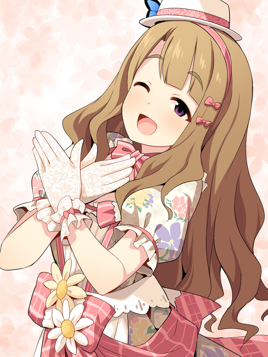 :d1girlblushbowbrown haircrossed wristsdressfloral backgroundfloral printflowergloveshair bowhatlacelace gloveslong hairlooking at viewerone eye closedopen mouthpink bowprint dresspuffy short sleevespuffy sleevespurple eyesshort sleevessmilesolotilted headwearvery long hairwhite dresswhite flowerwhite gloveswhite hat