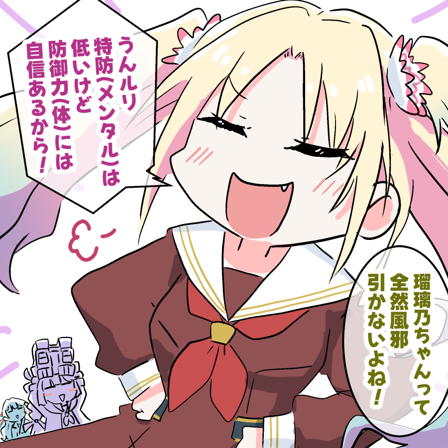 :d3girlsblonde hairblue hairblushblush stickersbreastsbrown dressclosed eyesdressfacing viewerfangflowergradient hairhair flowerhair ornamenthands on own hipshasu no sora school uniformholding above headlong sleevesmedium breastsmulticolored hairmultiple girlsneckerchiefopen mouthparted bangspartially coloredpink flowerpuff of airred neckerchiefsailor collarsailor dressschool uniformsimple backgroundsmilesolo focusspeech bubbletwintailsvirtual youtuberwhite backgroundwhite sailor collarwinter uniform