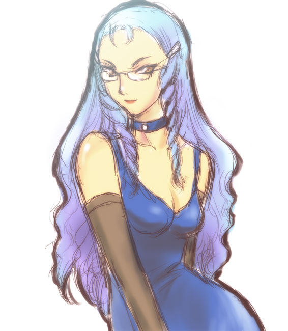 1girlblue hairbrown eyeschokerdressfemale focusglassesgloveshair ornamenthaircliplong hairlooking at viewersimple backgroundsittingsolowhite background