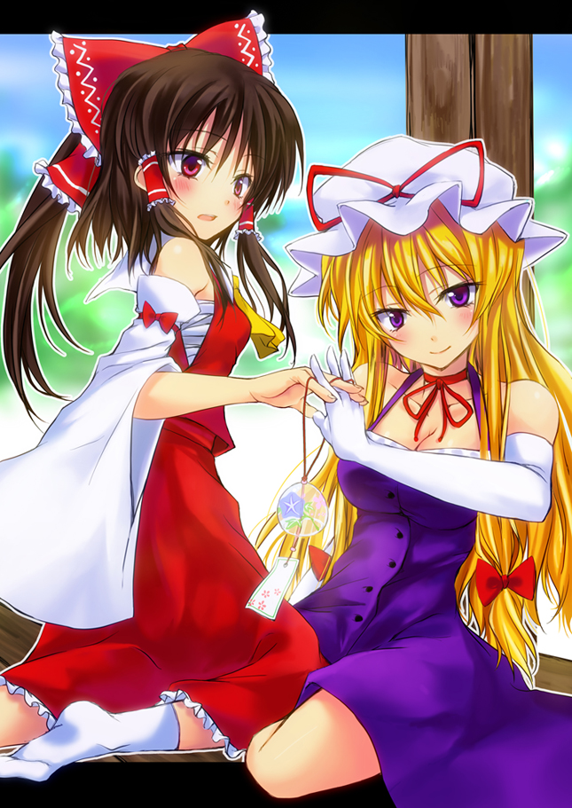 2girlsblonde hairblushbreastschokercleavageelbow glovesfemale focusgloveshatholding handsjapanese clotheskneelingletterboxedlong hairmikomultiple girlspurple eyesred eyesribbonribbon chokerwhite gloveswind chime