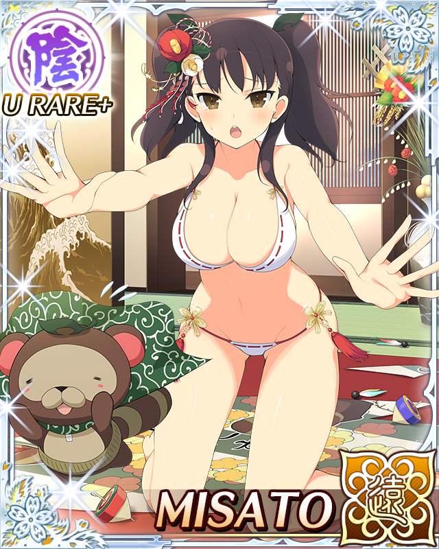 :o1girlahogebarefootbikiniborderbreastsbrown eyesbrown haircapecard (medium)character namegreen capegroinhair ornamentheartheart ahogeindoorskanzashikneelinglarge breastsleafleaf hair ornamentleaf on headleaning forwardlong hairlooking at viewernavelnew yearoutstretched armsshort twintailsshoujisliding doorssoloswimsuittatamitearing uptwintailswhite bikini