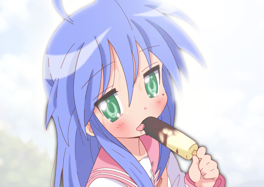 00s1girlblue hairchocolate bananachocolate-covered foodfemale focusfoodgreen eyeslong hairmolemole under eyepopsicleschool uniformserafukusolo