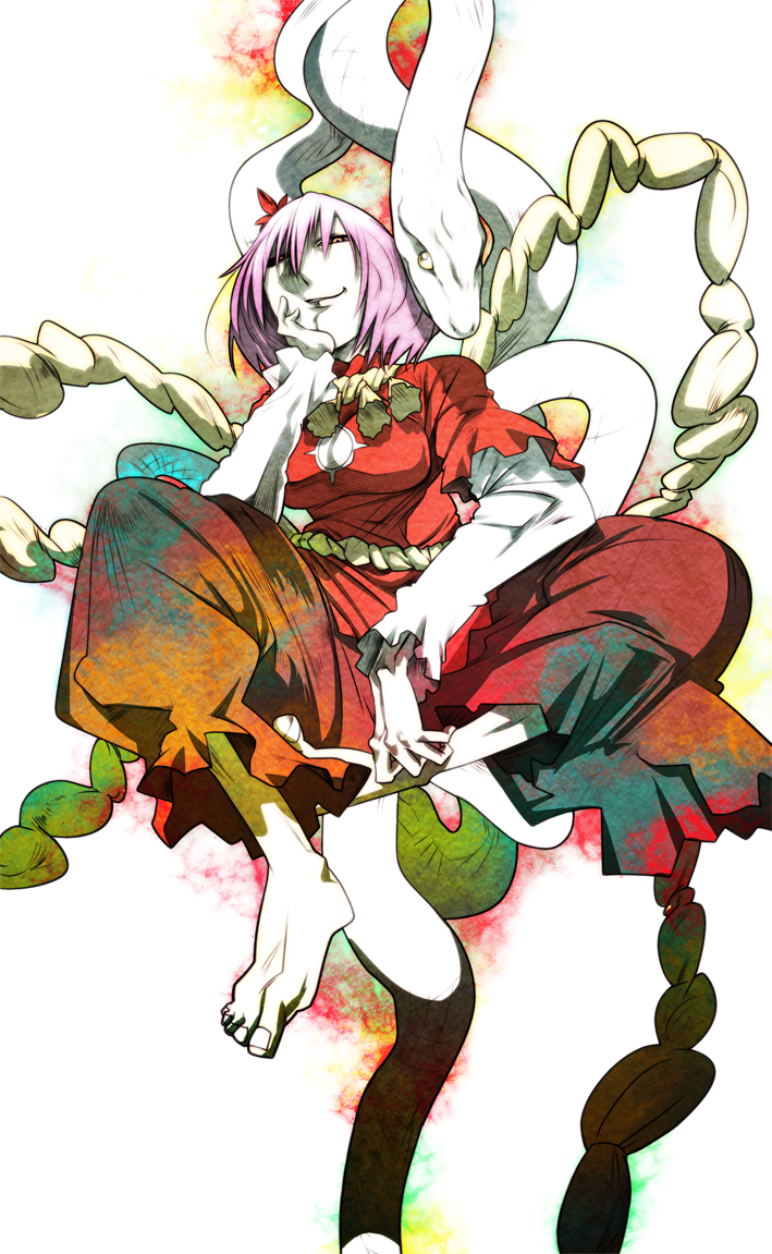 1girlbad anatomybad feetbarefootfeetfemale focuspoorly drawnpurple hairred eyesropeshort hairsnakesolo