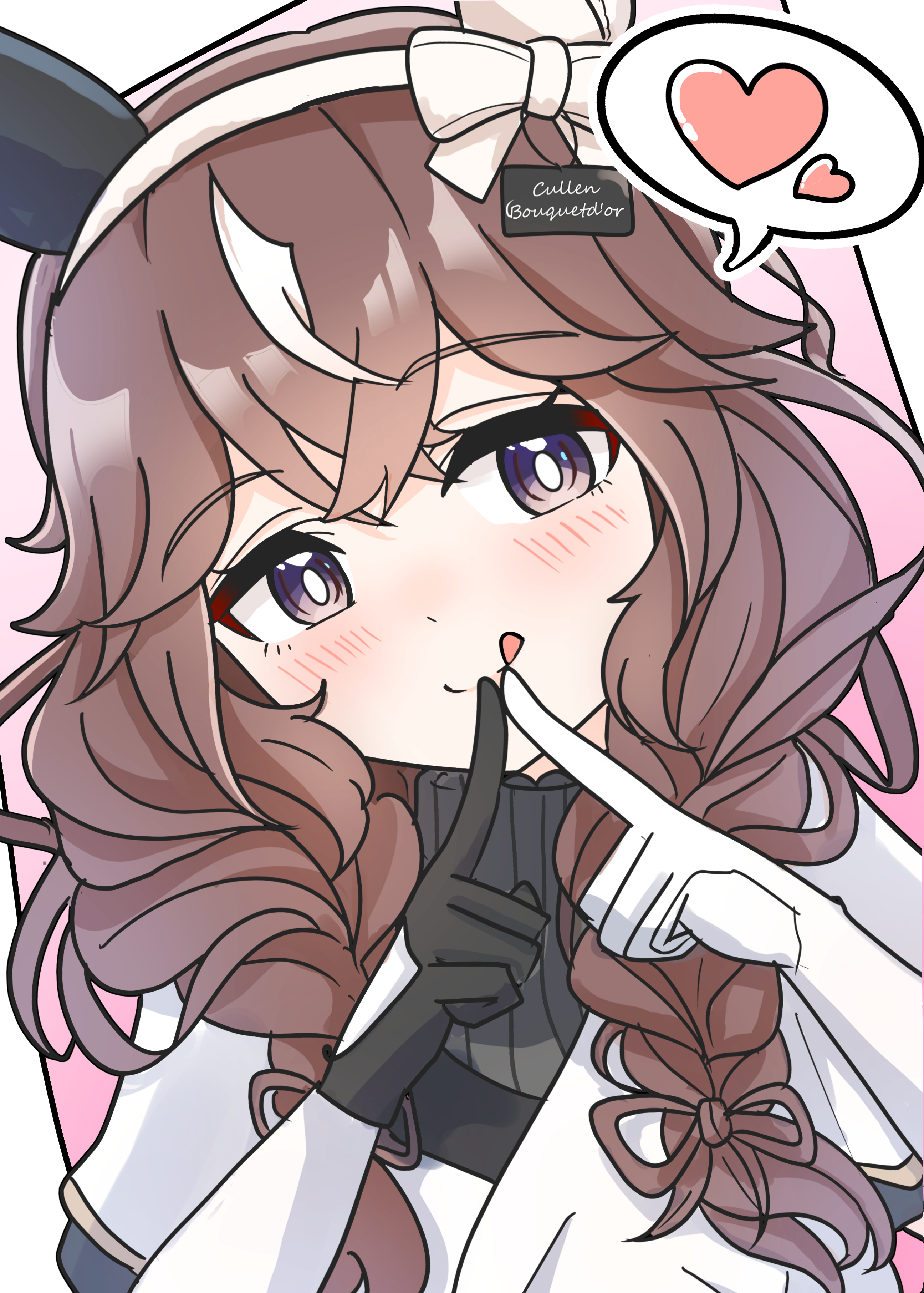 :p1girlanimal earsbraidbreastsbrown hairdetached sleevesfidgetinggrey eyeshair between eyeshair ornamenthairbandhearthorse girllong hairlooking at viewerlow twin braidssimple backgroundsmilespoken hearttonguetongue outtwin braidswhite background