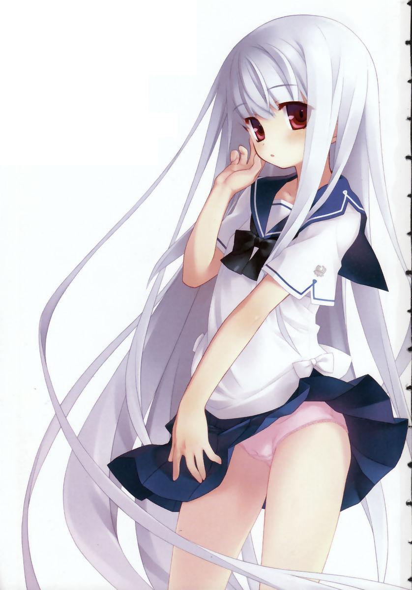 1girlblushcameltoeclothes liftfemale focuslolilong hairpantiespink pantiesred eyesschool uniformskirtskirt liftsolounderwearupskirtvery long hairwhite hairwindwind lift