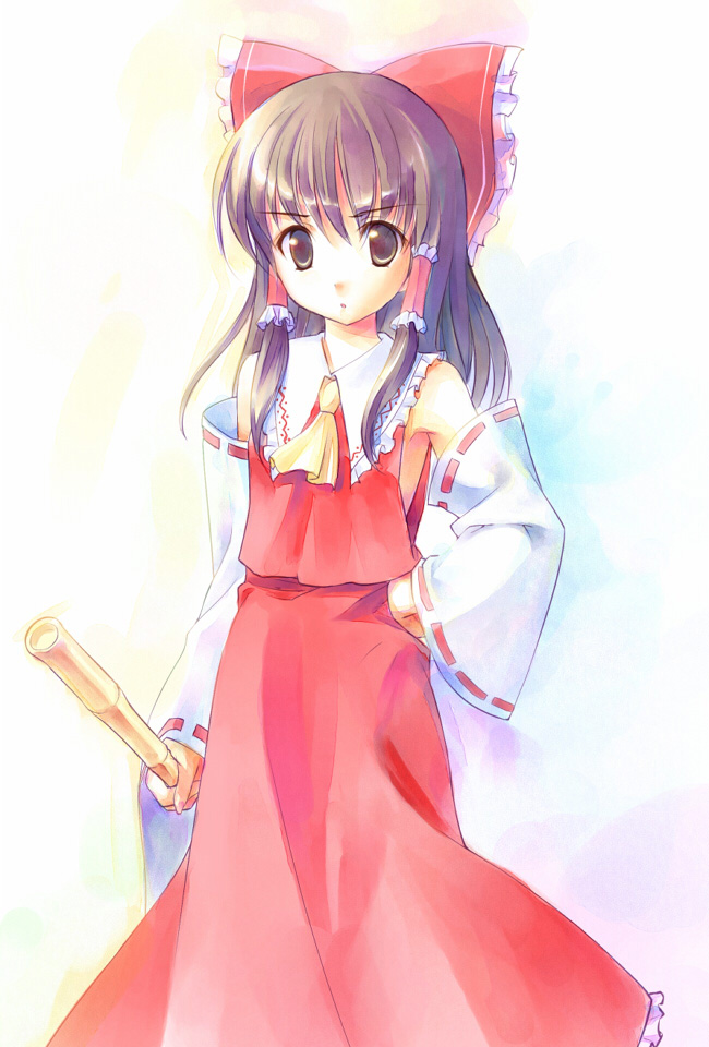 1girlbare shouldersbowbrown eyesbrown hairdetached sleevesfemale focusgradient backgroundhair bowhand on own hiphip focusjapanese clotheslong hairmikosolo