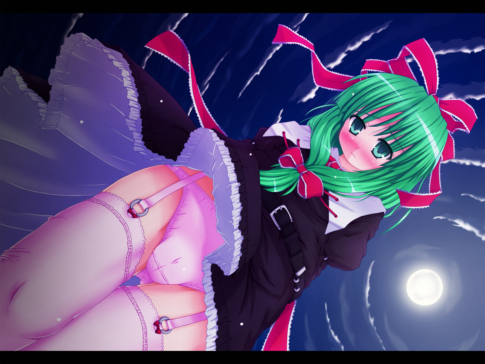 1girlblushcameltoefemale focusfrom belowfront ponytailgarter beltgreen eyesgreen hairhair ribbonmatching hair/eyesmoonpantiesribbonshort hairsolothighhighsunderwear