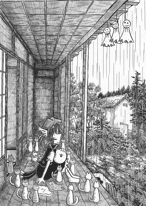 1girlcatfemale focusgreyscalemonochromerainshoujisliding doorssoloteruterubouzutoo manytoo many catsveranda
