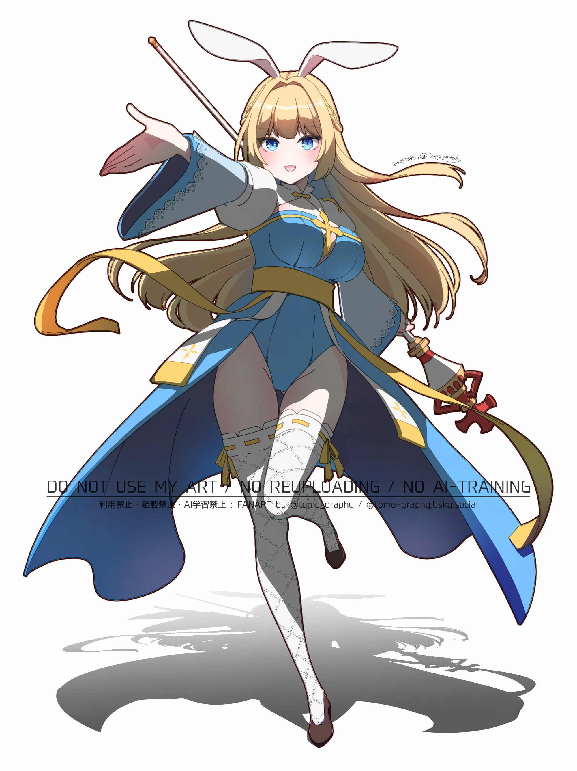 1girlanimal earsblack shoesblonde hairblue dressblue eyesblue leotardblushbreastsbunny daycleavage cutoutclothing cutoutcrossdressfishnet thighhighsfishnetsfull bodyholdingholding staffjuliet sleeveslarge breastsleotardlong sleeveslooking at vieweropen mouthpuffy sleevesrabbit earssashshoessimple backgroundsmilesolostaffstandingstanding on one legthighhighstwo-tone dresswatermarkwhite backgroundwhite dresswhite thighhighsyellow sash