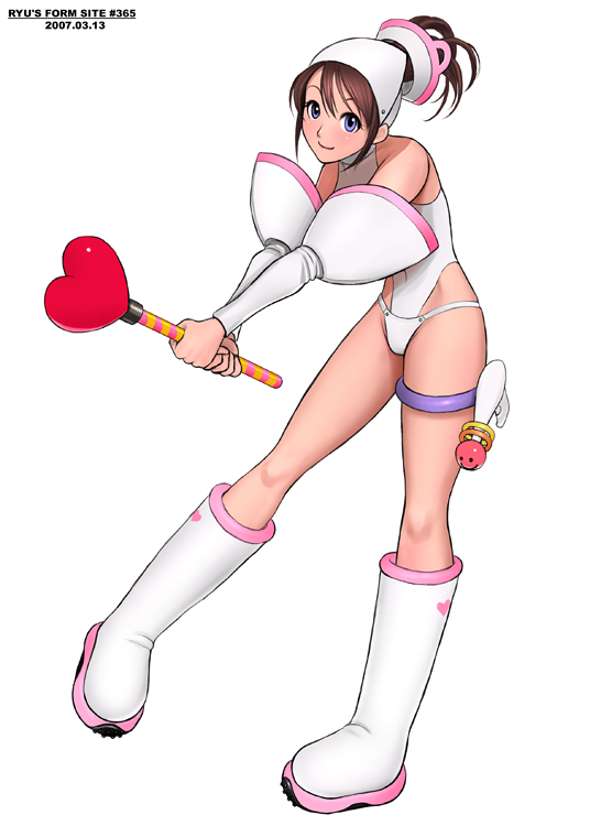 1girlblue eyesbootsbrown hairfemale focusfull bodyheartleotardpinup (style)ponytailshoessimple backgroundsolowandwhite background