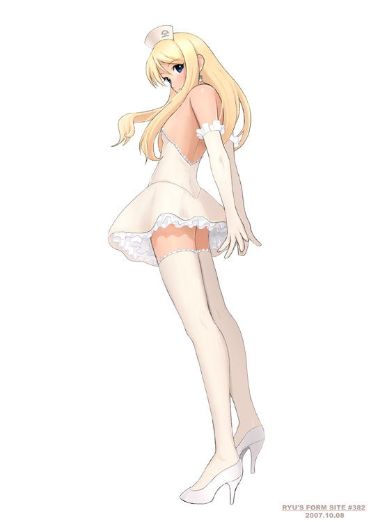 1girlassbackblonde hairblue eyesdressearringselbow glovesfemale focusflat assfull bodygloveshathigh heelsjewelrylegslong hairlong legsnurse cappinup (style)shoessimple backgroundskinnyskirtsolothighhighswhite gloveswhite skirtwhite thighhighszettai ryouiki
