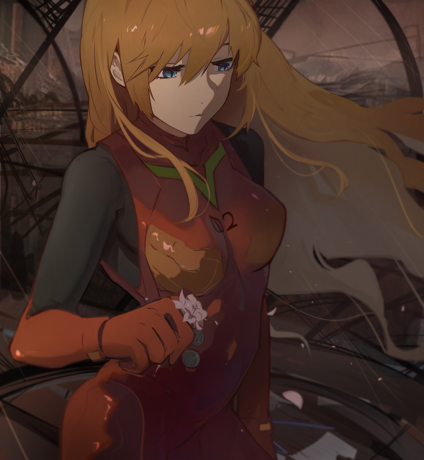 1girlblue eyesbodysuitbreastsclosed mouthcowboy shotfloating hairflowerhair between eyesholdingholding flowerlong hairmecha pilot suitmedium breastsmulticolored bodysuitorange hairplugsuit (evangelion)red bodysuitsceneryskin tightsolostanding