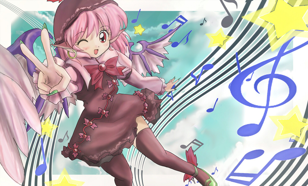 1girlanimal earsearringsfemale focusfingernailsgreen nailshatjewelrylong fingernailsmusical notenail (hardware)nail polishone eye closedpink hairred eyesshort hairsolothighhighsvwingswink