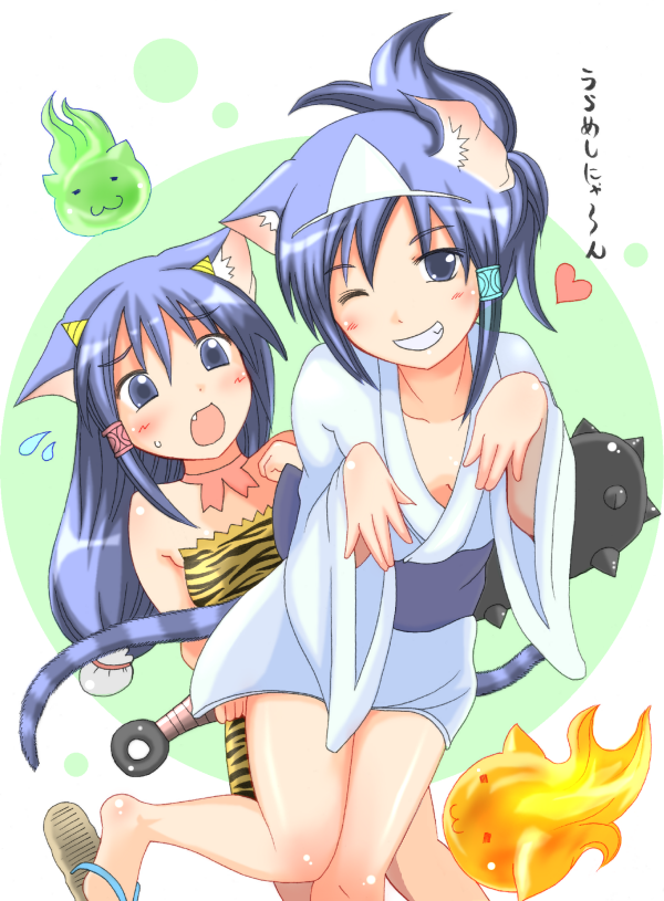 :32girlsanimal earsanimal printblue eyesblue haircat earscat tailclub (weapon)cosplaydownblousefangghosthearthornskanaboulong hairmatching hair/eyesmultiple girlsone eye closedonisandalssiblingssisterstailtiger printtwinsweaponwink