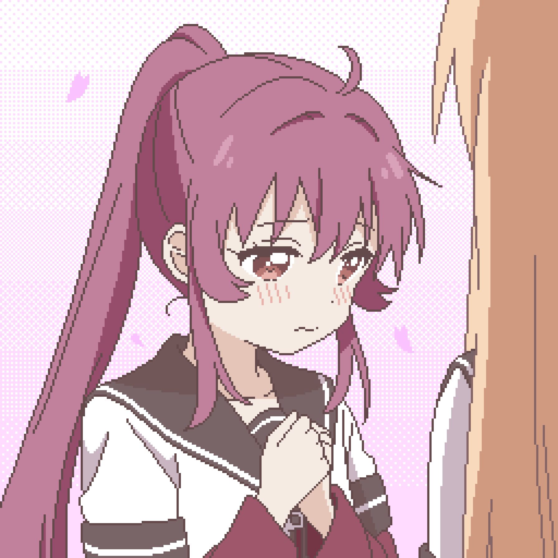 2girlsblack sailor collarblonde hairblushcollarboneconfessioncouplefurrowed browlong sleeveslooking downmultiple girlspink backgroundpink petalspixel artponytailpurple eyespurple hairsailor collarsailor shirtshirtshysimple backgroundupper bodywavy hairyuriyuru kaze