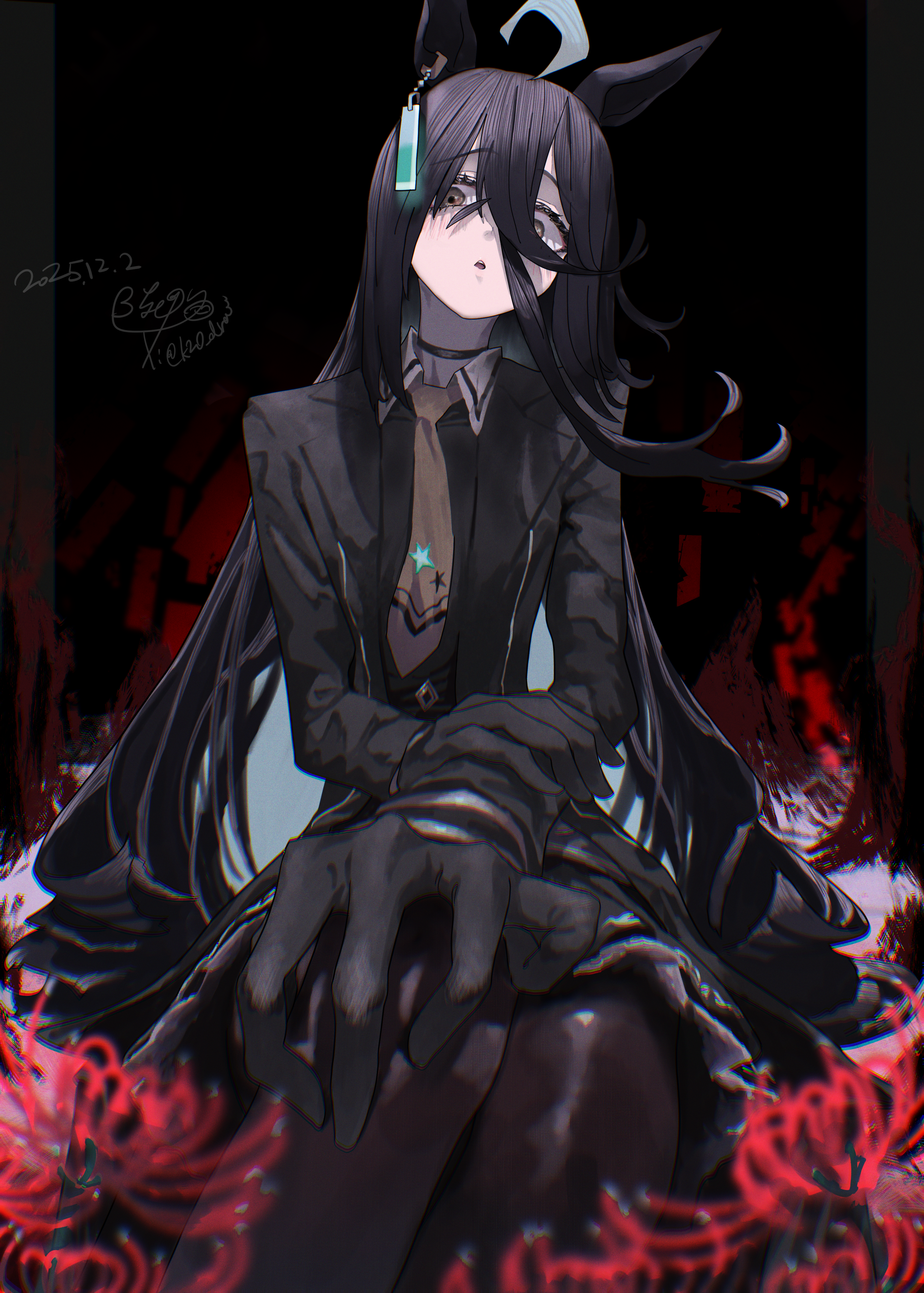 :o1girlahogeblack chokerblack coatblack glovesblack hairblack pantyhoseblack shirtblack skirtchokercoatcollared shirtdatedflowergloveslong hairlooking at viewernecktiepantyhosered flowershirtsignatureskirtsolospider lilyvery long hairyellow eyesyellow necktie