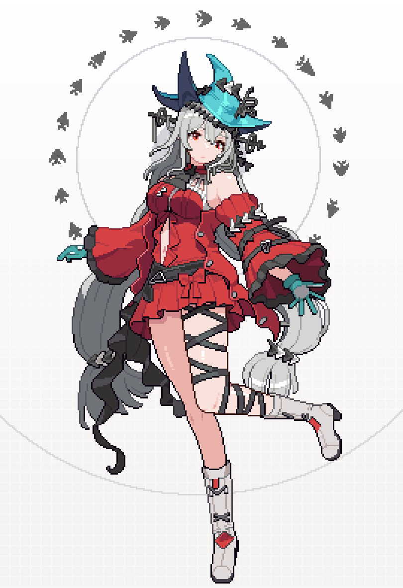 1girlangelfishaqua glovesaqua hatascotbare shouldersblack ascotbootsbreastsclothing cutoutdetached sleevesdressfishglovesgrey hairhatleg ribbonlong hairlooking at viewerlow-tied long hairmedium breastsnavelnavel cutoutofficial alternate costumepixel artred dressred eyesribbonsleevelesssleeveless dresssolowhite boots