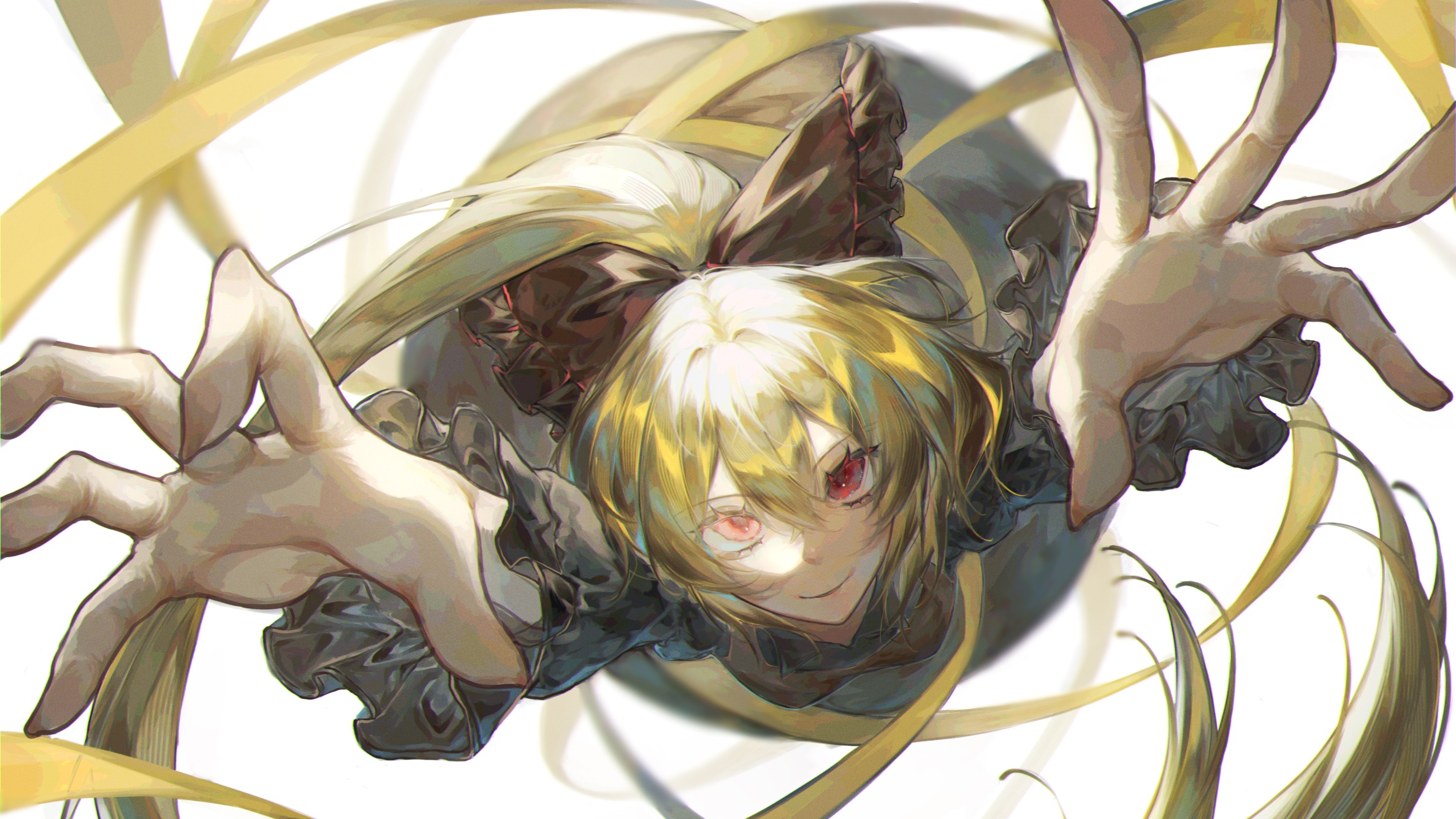 1girlblack shirtblonde hairbowbrown bowbrown dressclosed mouthdressfingernailsfloatinghair between eyeskeikeikeichalong hairlong sleeveslooking at viewerponytailreachingreaching towards viewerred eyessharp fingernailsshirtsmilesolovery long hairwhite background